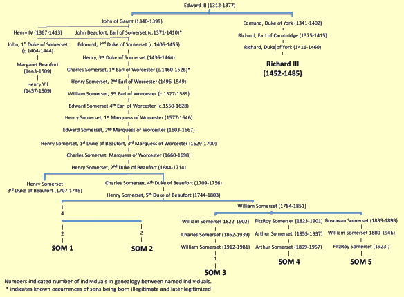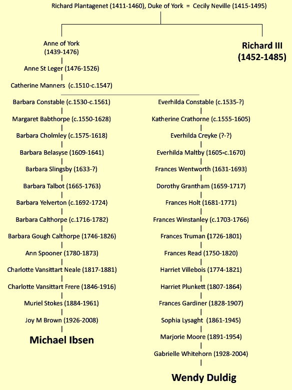 The other DNA testing that could be undertaken is to follow the all male line and the Y chromosome. Here we face a significant problem. Male descent is often easier to trace because traditionally men are generally better documented than women, but while we can always be sure who someone’s mother was, the identity of their biological father may be less certain. This is what the newspaper article was all about. At least one male in the lineage to the present day was illegitimate! This was discovered simply because Richard III's line died out and so researchers had to go back in time to Edward III for whom they were able to obtain a sample of yDNA and then work through to the present day.