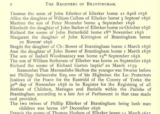 Pictured: Part of a page from the Yorkshire Parish Register Society publication, The Registers of Brantingham 1902.