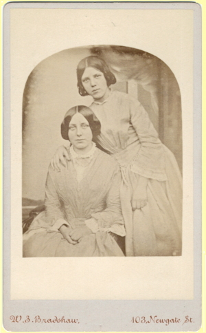 Mary Jane Puttick with her sister, Ellen b. 11 November 1837? This photograph in itself presents a conundrum resolved by close inspection. The mount is 1890 but the girls are clearly in 1840s style costume and hair. The studio in the background lacks features expected and the pose adopted suggests the need to remain quite still for a relatively lengthy period. It is a photograph of an older photo. In the 1840s the daguerreotype was a one-off photo and later families wanted multiple copies to share around and this problem was resolved by having a professional take a photograph of the daguerreotype. Family historians need to watch out for this in their collections.
