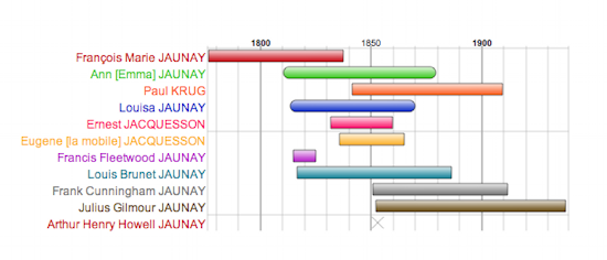 One powerful strategy in family history is to prepare a time line and enter every event for all your ancestors on to the continuum. Not only may you discover obvious errors in your data with events out of logical sequence but the relationship between events may provide you with useful background and open up new lines of research. Here is an example using a database but it works equally well with spreadsheets. Good family history programs will also generate timelines. Unfortunately these usually lack the required detail as can be seen from the following example by Reunion.