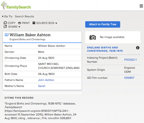 A search at Familysearch confirms that William Baker Ashton was baptised at St Michaelchurch Somerset, the son of John Ashton and Sarah.