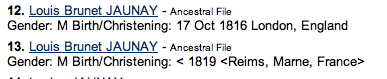 Jaunay entry in the LDS Ancestral file at familysearch.org