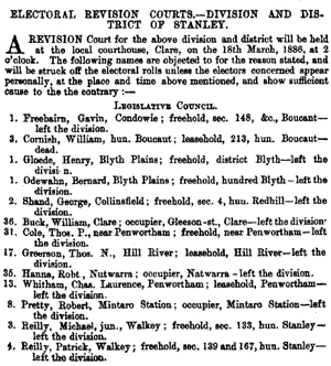 While not Electoral Rolls per se, the Government Gazette notices of the Electoral Revision Courts name individuals and their addresses scheduled to be struck off the roll due to change of address. For a fuller treatment on this material, it is recommended that the reader access, Tony Bott: South Australian electoral rolls 1852–1904: a user's guide, 1999 as this lists all such entries by electoral district in the gazettes 1879–1904.