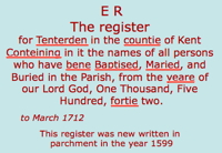 and its mode. Clearly the provenance of the record is very important. Original sources are records that contribute written, oral, or visual information whereas derived material, that is material copied, abstracted, transcribed, or summarised from existing sources, may carry less weight. It rather depends on the process. Obviously a photocopy/photograph/scan (providing it is complete) must have an equal weight as its original and far more weight than a transcription, abstract or summary. This can of course be over simplistic as the original or primary record may be wrong—either by accident or intention! Rather than provenance, this latter aspect relates to quality. In spite of what has just been written, primary material, that is material recorded at or near the time of the event is deemed more correct than secondary material, that is material compiled at a later date. Sometimes it can be quite difficult to determine the status of the record in question. For example, consider the census returns widely used to develop family histories. They are in fact, not primary records but compilations of household schedules and therefore very much secondary records prone to a higher level of error. Consider the 1542–1712 parish register for St Mildred Tenterden in Kent. The register statement in the front [pictured] clearly indicates that the material within it is both primary and secondary in that the 1542–1599 records were copied from the original [paper] register, while the subsequent entries are the originals! The St Mary the Virgin Docking NFK register probably has the same combination as its cover indicates a pre-1599 start. [pictured] In 1599 it was decreed that registers henceforth had to be written on parchment when previously they had been paper. Many incumbents or parish clerks copied the contents of the former register into the new one. Knowing that this behaviour was widespread also demonstrates another requirement for successful research—understanding the family in their historical context!