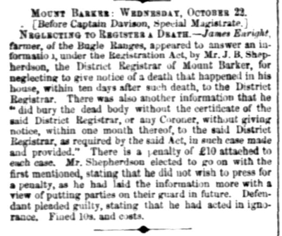 There are examples where the certificate can be found in District Records but does not appear in the state-wide index of the Principal Registrar. Some information did not even get to the District Registrar. When James Enright's wife, Mary, died at their Bugle Ranges home on 6 Sep 1856, James just buried her out the back! On this occasion the news reached the ears of the authorities and James was prosecuted. His defence was that he was ignorant of the need to report a death!