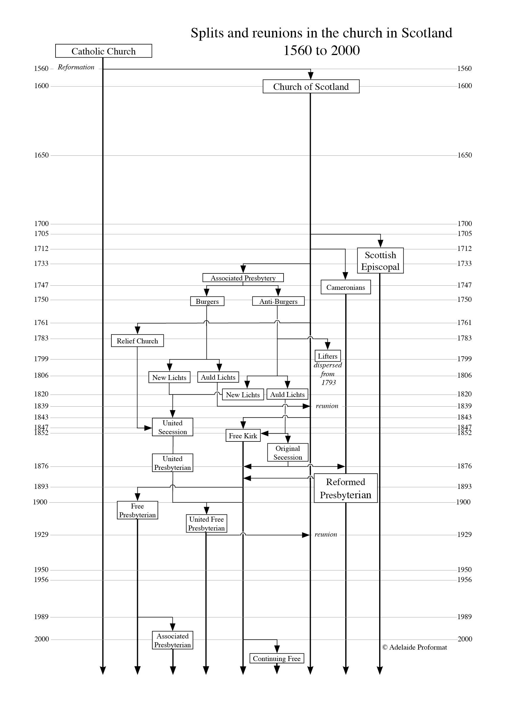 The Established Church of Scotland has experienced a large number of schisms since the Reformation and these break away groups in turn divided into further groups. This makes locating church records very difficult and the researcher needs to be reminded that the records held at New Register House in Edinburgh relate to the Established Church of Scotland and not to these break away groups or indeed any of the more recent non-conformist churches.